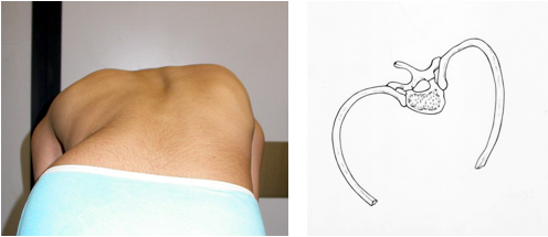 Fig. 4 a-b: Gibbo dorsale destro. Disegno schematico che mostra la rotazione dei corpi vertebrali alla base della deformazione della gabbia toracica