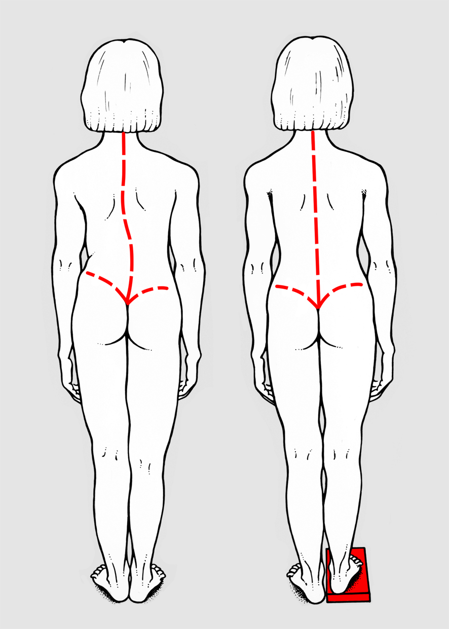 L’atteggiamento scoliotico è quasi sempre sostenuto da piccole differenze di lunghezza degli arti inferiori (fig. 3), minime e non diagnosticabili nei primi anni di vita, apprezzabili invece in età scolare, quando la dismetria raggiunge almeno i 5-6 mm ed è misurabile clinicamente. La conseguente deviazione della colonna ha tutte le caratteristiche degli atteggiamenti scoliotici: assenza di gibbosità quando il paziente è a tronco flesso, scomparsa della curva in posizione prona. In ortostatismo è sufficiente mettere sotto il calcagno dell’arto più corto un rialzo corrispondente alla dismetria per far sparire la deviazione della colonna.
