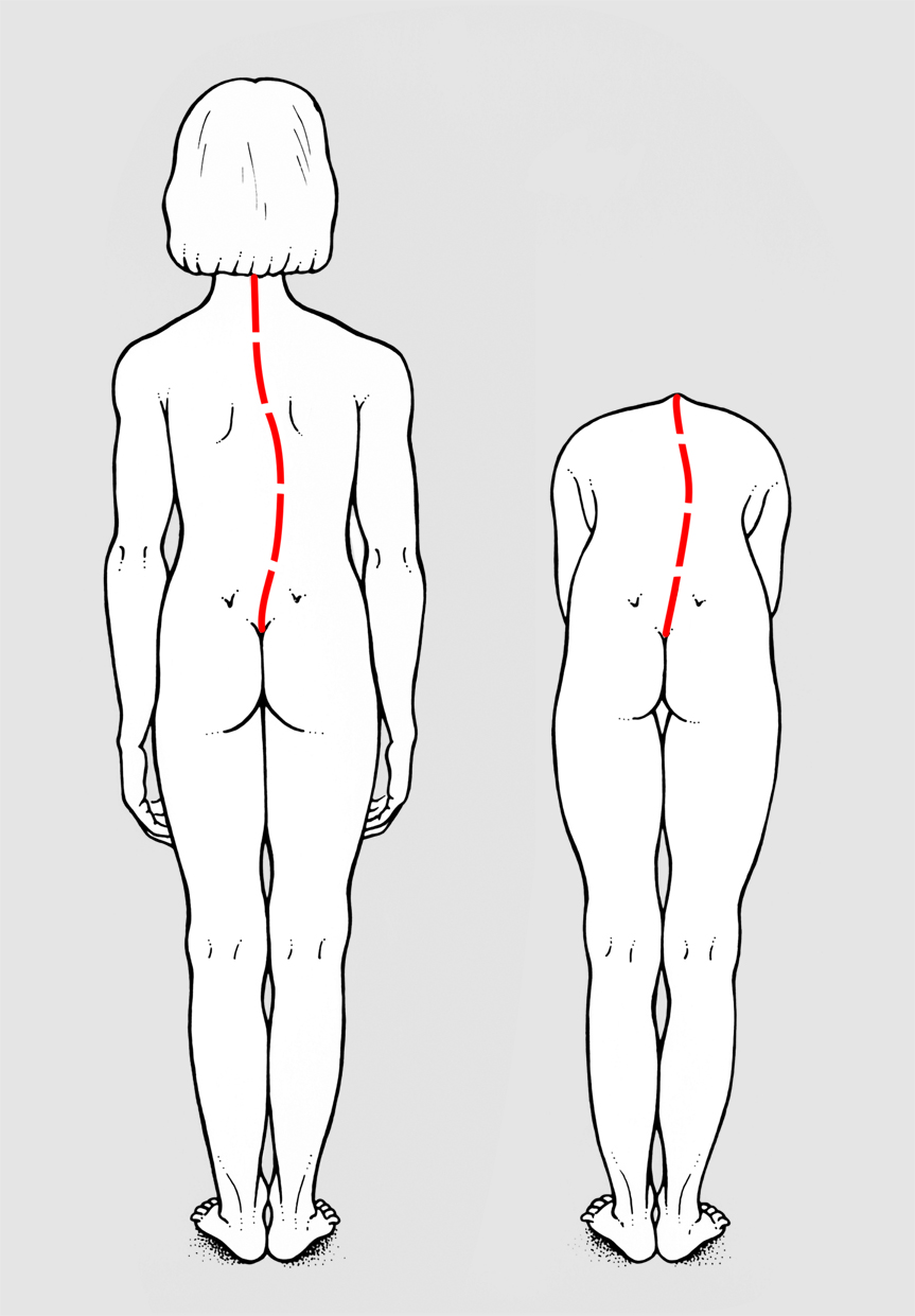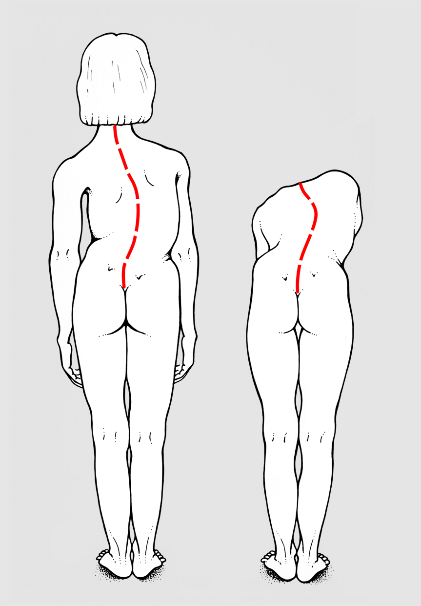 L’atteggiamento scoliotico (fig. 1) è una deviazione della colonna sul piano frontale completamente riducibile in clinostatismo. La scoliosi vera (fig. 2) è una deviazione permanente della colonna sullo stesso piano, non riducibile in clinostatismo, accompagnata da una rotazione dei corpi vertebrali responsabile di gibbosità.