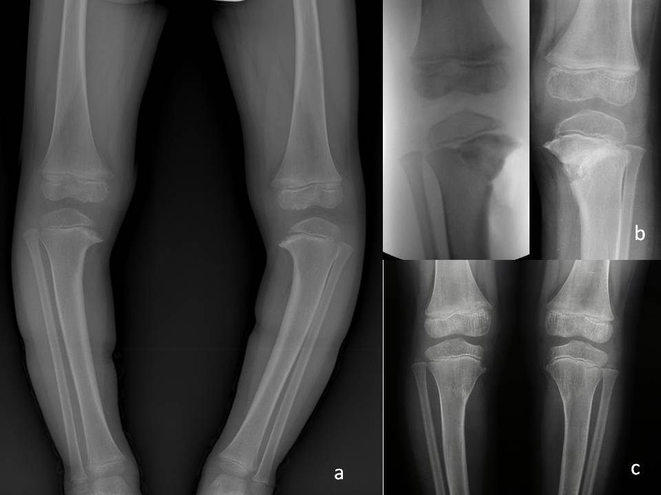 fig 14 ← Precedente Fig. 14: A) Aspetto radiografico del paziente in fig 13. B) Intervento di osteotomia di sollevamento del piatto tibiale bilaterale. C) Controllo RX dopo 2 anni.