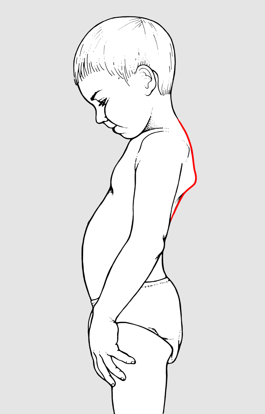 Consiste nel sollevamento del bordo vertebrale della scapola che si allontana dal piano del torace e diviene più sporgente. Può essere mono o bilaterale. In quest’ultimo caso la causa più frequente è un dorso curvo astenico (fig. 1), in cui si osserva un’accentuazione delle cifosi e della sottostante lordosi lombare, addome prominente con ipotonia degli addominali. La buona autocorreggibilità in posizione eretta e seduta, l’assenza di dolori e di rigidità orientano verso una forma “benigna” di dorso curvo, da trattare con attività sportive come nuoto e ginnastica, ma bisogna essere ben certi che non si tratti di una distrofia muscolare debuttante.