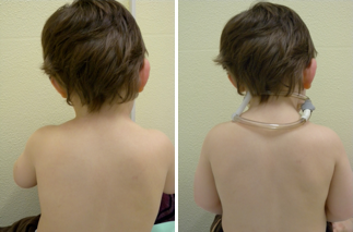 Fig. 2: Torcicollo miogeno sinistro, collare morbido per contrastare l’inclinazione laterale del capo verso sinistra.