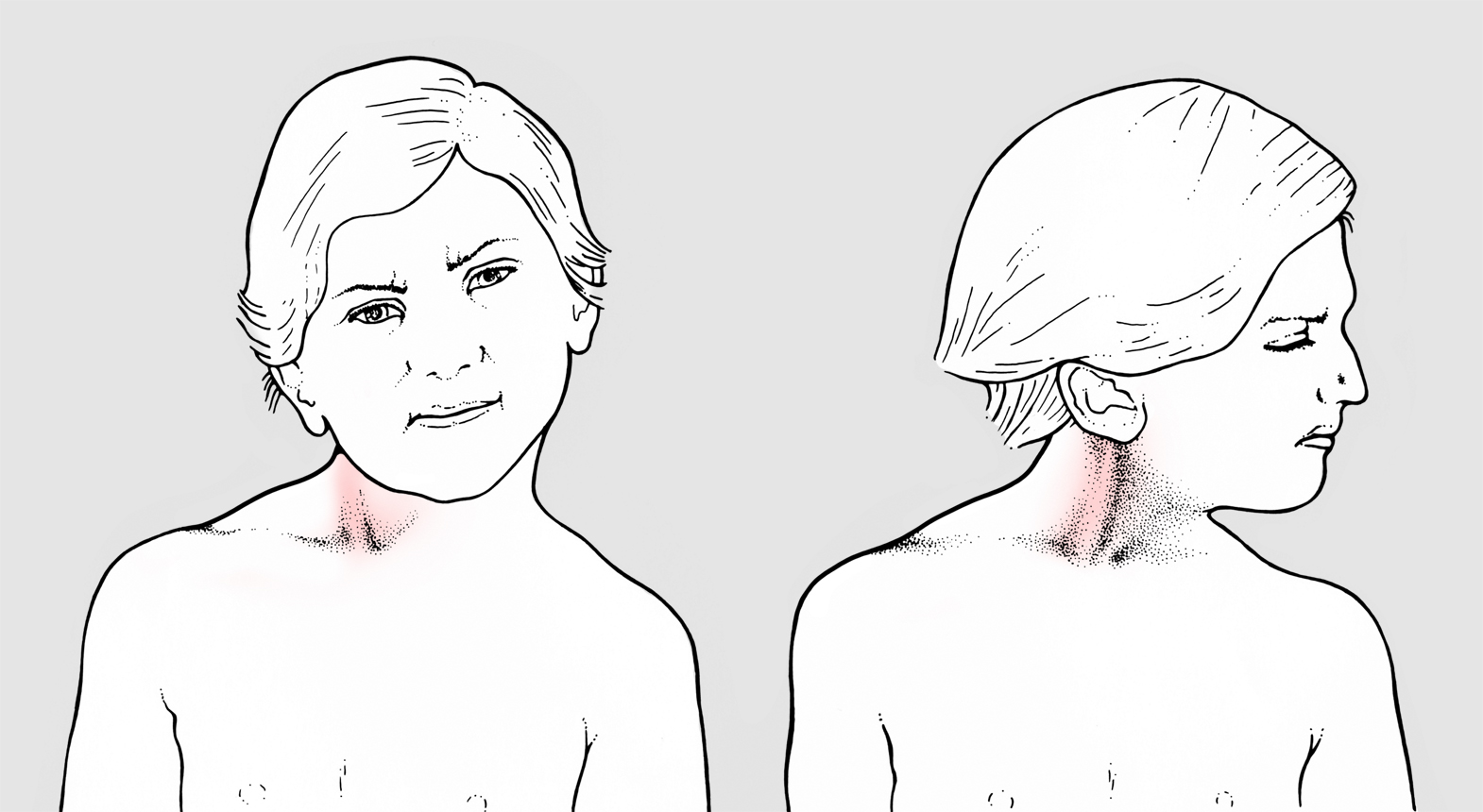 Torcicollo miogeno (fig. 1). E’ dovuto ad una compromissione congenita o connatale (parto distocico) del muscolo sternocleidomastoideo (SMC). Alla nascita può essere presente nel suo contesto una formazione duro-elastica, rotondeggiante o fusata (“oliva”) dovuta ad un ematoma che tende lentamente a scomparire; a volte una vasta porzione del muscolo appare diffusamente infiltrata e di consistenza aumentata. Con il passare dei mesi si può assistere alla organizzazione in tessuto fibroso-cicatriziale della porzione di muscolo interessata, con indurimento e retrazione che finiscono per fissare la deformità rendendola permanente. Sono descritti casi sicuramente congeniti (alterazioni di sviluppo del muscolo, forse su base vascolare) ed altri insorti dopo un parto distocico. Dal punto di vista clinico, l’ispezione e soprattutto un’accurata palpazione della regione porteranno alla diagnosi, confermata dall’esame ecografico. Per mettere in tensione lo SCM e riscontrare più agevolmente variazioni di consistenza e tensione, è necessario porre il capo in estensione (eventualmente portandolo fuori dal lettino, sostenuto dalle ginocchia dell’esaminatore o dalla sua mano) e inclinarlo dal lato opposto rispetto a quella della deformità.